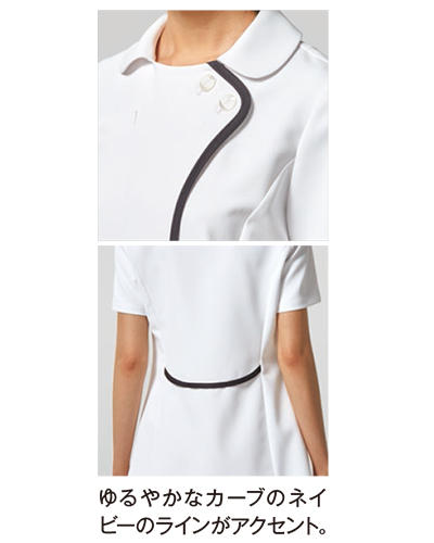 凛とした佇まい、洗練された雰囲気が印象的なデザイン。ネイビーの曲線的ラインがアクセント。 【織物素材】 アレニエ(ポリエステル100%) 【仕様】 右胸に携帯・PHS対応ポケット付/右腰ポケットに内ポケット付