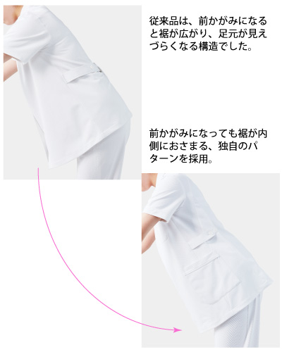 前かがみになっても裾がおさまる、独自のパターンを採用。