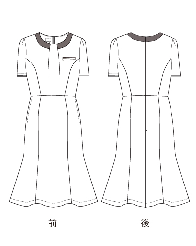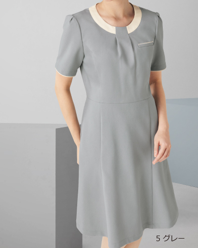 首まわりのデザインが印象的なおもてなし向けワンピース。使用しているフルーレクスは、今までの布帛素材では出せなかったストレッチ感もありつつ、工業洗濯対応、速乾性、イージーケア性も有する素材です。スカーフがなくてもフォーマルな印象をつくる襟元は、ジャケットを羽織った際もお顔まわりのアクセントに。スカート部分はほどよいマーメイドシルエットで、女性らしさを演出しています。メディカルユニフォームでは珍しい上品なツイード調の素材のワンピースです。