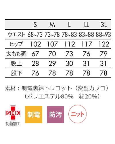 素材:制電裏綿トリコット(変型カノコ)(ポリエステル80% 綿20%)