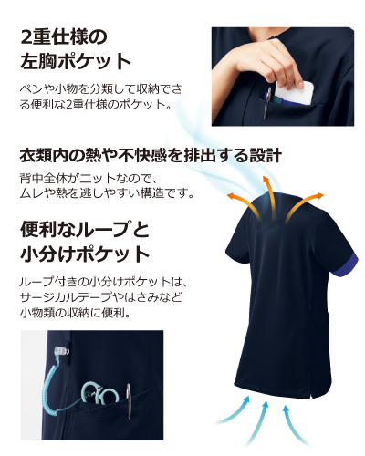 白衣・ナースウェア・介護服・エステウェア通販|ナースウェアドットコム スクラブ FOLK(フォーク)> スクラブ 涼しい素材・工夫のアイテムスクラブ スクラブスクラブ(男女兼用) 7088SC FOLK(フォーク) ジップスクラブ 男女兼用 定価: ¥9,680(税込) 価格: ¥6,776 (税込) 30%OFF [ポイント還元 67ポイント~] 販売期間: カラー: 選択してください 7 ダークネイビー×ミディアムブルー 13 ダークネイビー×フクシャピンク 16 ダークネイビー×バーガンディ 17 バーガンディ×ダークネイビー 27 ライトグレー×ダークネイビー 36 ラベンダー×バーガンディ 47 ミディアムブルー×ダークネイビー サイズ: 選択してください 3S SS S M L LL 3L 4L 数量: 個 在庫 ○ カラーサイズ7 ダークネイビー×ミディアムブルー3SSSSMLLL3L4L13 ダークネイビー×フクシャピンク3SSSSMLLL3L4L16 ダークネイビー×バーガンディ3SSSSMLLL3L4L17 バーガンディ×ダークネイビー3SSSSMLLL3L4L27 ライトグレー×ダークネイビー3SSSSMLLL3L4L36 ラベンダー×バーガンディ3SSSSMLLL3L4L47 ミディアムブルー×ダークネイビー3SSSSMLLL3L4L 返品・交換についての詳細はこちら レビューはありません ジェンダーレスな新しいシルエット。男女兼用で管理もラクラク! 袖の蛍光フラップはスタッフの役割明示に。 衣類内の熱や不快感を排出する設計。 手指消毒液用ファスナーやポンプ固定用ループなど、機能面も充実。 【素材】 アリオンストレッチ(ポリエルテル100%) ジアスムース(ポリエルテル100%) ※男性基準のサイズ展開になっています。女性の方は、ツーサイズ下がおすすめです。 ※サイズ表で製品サイズをご確認の上、ご注文ください。 コーディネート商品 5030SC FOLK(フォーク) パンツ 男女兼用 定価: ¥8,360(税込) ¥5,852(税込)