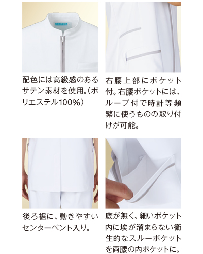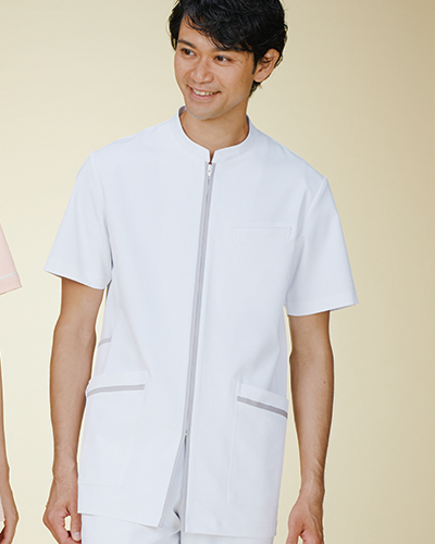 動きやすさ、収納性など機能を高めた前開きスクラブの『Smart Scrub-スマートスクラブ-』に知的で上品さを加えたエレガントシリーズです。誠実さを感じさせる立ち衿タイプ。レディスジャケットとペアデザインで揃えることで、チームの一体感もアップします。 【織物素材】 ストレッチセンサー(ポリエステル100%) 【仕様】 左胸に携帯・スマートフォン対応ポケット付/右脇ポケット付/両腰ポケットに内ポケット付/右腰ポケットにループ付