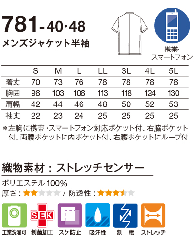 工業洗濯可、制菌加工、透け防止、吸汗性、制電、ストレッチ