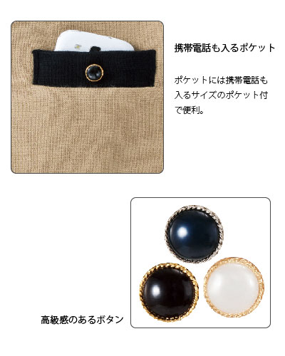 ラウンドネックの配色使いや、光沢のあるボタンで、おもてなしモードを演出します。