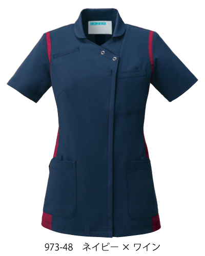 衿付にすることできちんと感を演出。さらにストラップが直接首元に当たりにくくなっています。 動きやすさ、収納性など機能を高めた前開きスクラブの『Smart Scrub-スマートスクラブ-』シリーズは衿の高さやポケット等、仕様にもこだわっており、ショルダーから脇にかけての切り替え配色でスマートに着こなせます。 【織物素材】 ストレッチセンサー(ポリエステル100%) 【仕様】 両胸に携帯・PHS対応ポケット付/両腰ポケット二重仕様/右腰ポケットにループ付/比翼ファスナー仕様