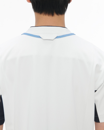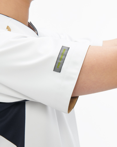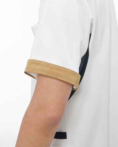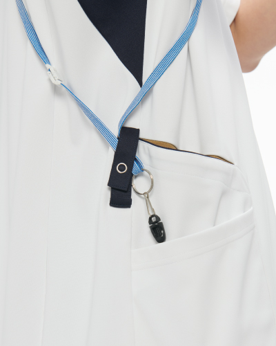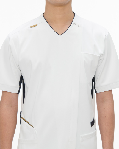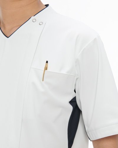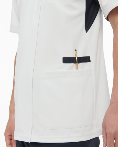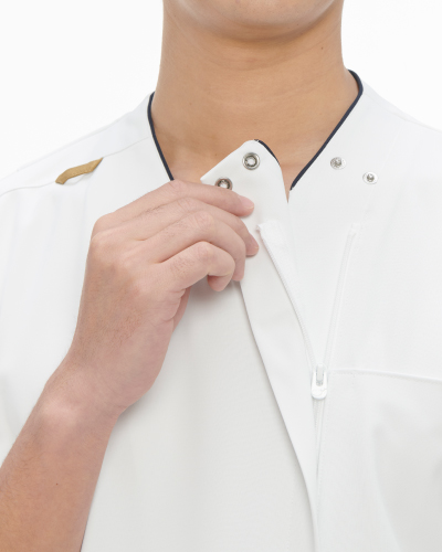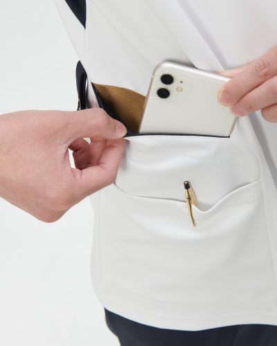 様々な機能をちりばめたフロントファスナー開きの男女兼用ホワイトスクラブです。動きやすくて涼しいプロファンクション機能を搭載し、スマートフォン用ポケットや多機能ループ、ストラップをかけられる衿吊りなど最新の機能をたくさん盛り込んでいます。