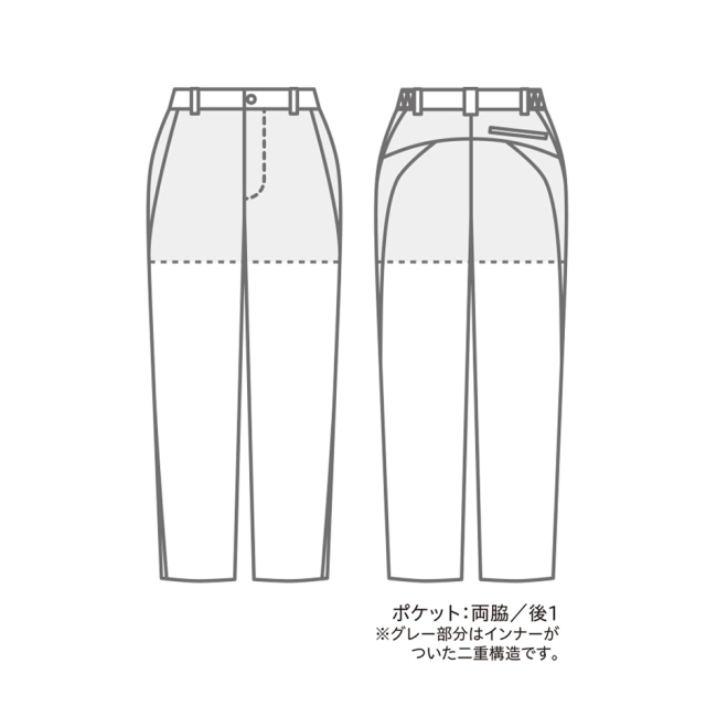 ・ストレッチ性に優れた素材利用で快適に着用することが可能・なめらかな風合いと軽い着心地がポイント・ポケット両脇/後1 【素材】・ハイパーストレッチトリコット(ポリエステル100%) SEK、透け防止(ホワイトのみ)、吸汗速乾、制電、防汚、ストレッチ