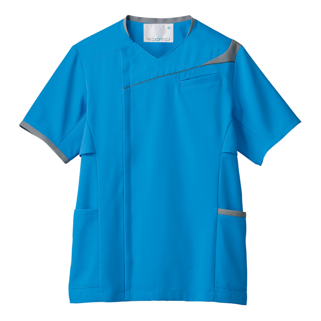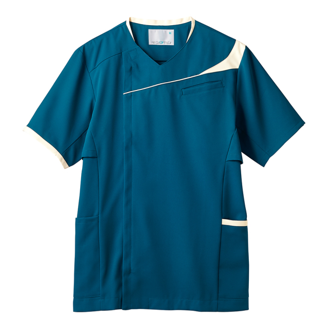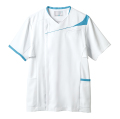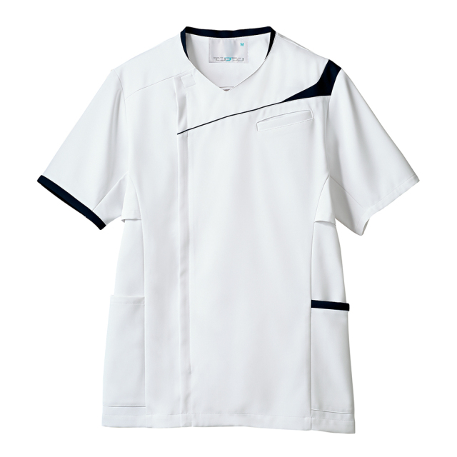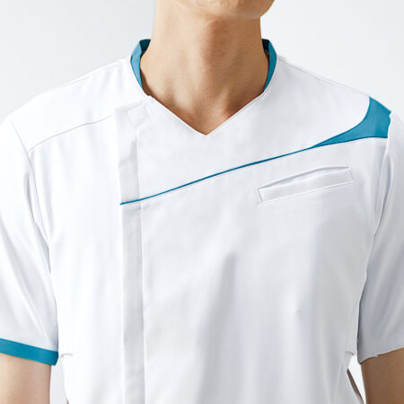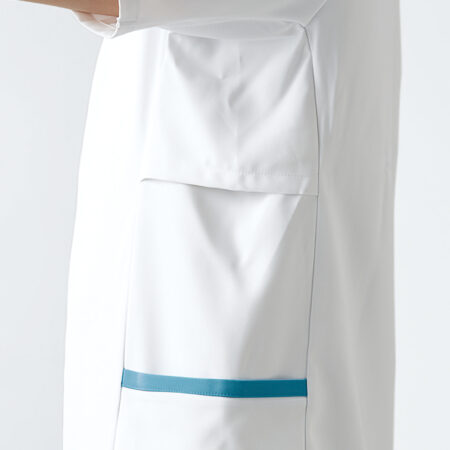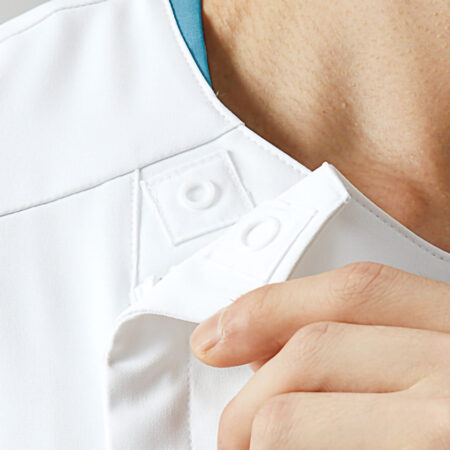 ・着脱が簡単な肩口スナップテープ仕様。・脇下は衣服内の通気性を高めるベンチレーション仕様。・背中上部にPHSや名札用ストラップのズレを軽減させるストラップホールド。・脇ポケットには小物を整理しやすい内ポケット付き。【素材】・ソフトラチネ(ポリエステル100%) 制菌加工、透け防止、吸汗、制電、防汚