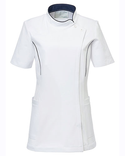 光沢感のあるパイピングが映え、洗練された印象に。デザイン性と機能性を両立する襟先のカッティングで、前屈みになった際の窮屈感を解消します。 素材:スターフィットLT防縮ニット(ポリエステル100%)