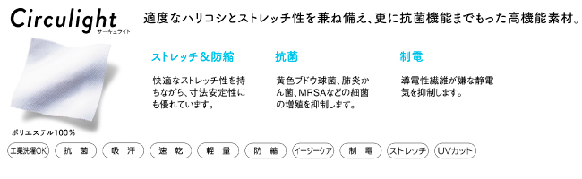 [素材]ポリエステル100% (サーキュライト)[機能]工業洗濯OK・抗菌・吸汗・速乾・軽量・防縮・イージーケア・制電・ストレッチ・UVカット