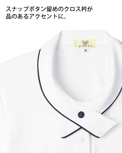 ・スナップボタン留めのクロス衿がポイント。