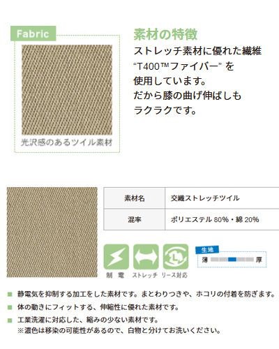 ストレッチ素材で動きやすく、洗濯にも強いチノパンツ。【素材】ポリエステル80%・綿20%[交織ストレッチツイル] 制電・ストレッチ