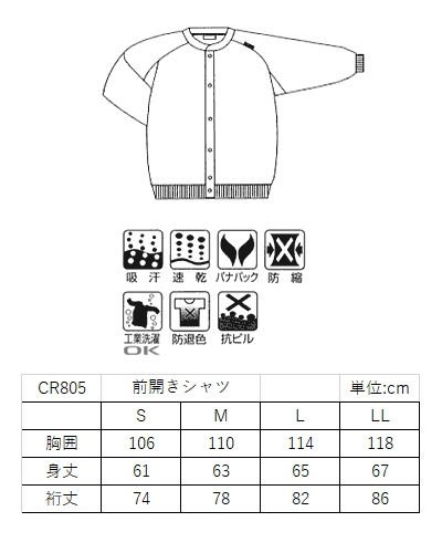 KIRAKU(キラク) トンボ ケア◆CR805 14 76 46 12 83 男女兼用 前開きシャツ◆コンフォートウェア◆ポリエステル85%、綿15%[リップルウェーブ防縮ニット]◆工業洗濯、防縮、吸汗、速乾、軽量、防退色、抗ピル