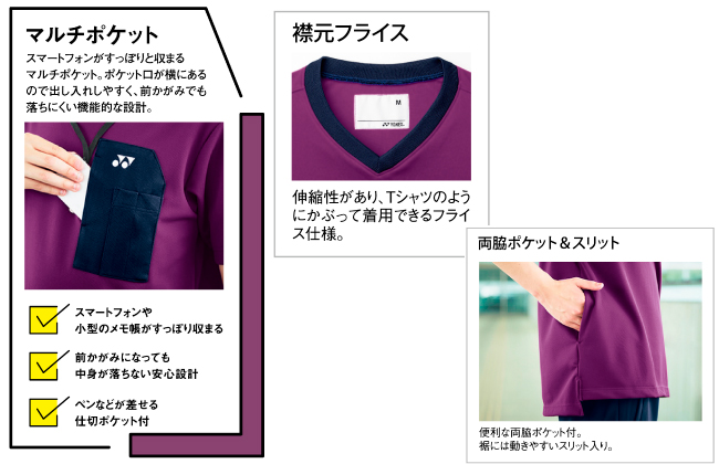 CY874 ネオスクラブ 男女兼用 ◆YONEX(ヨネックス) 前かがみでも安心!デザイン性と作業性を兼ね備えた多機能ポケット ◆素材:ポリエステル100%(はためきニット)