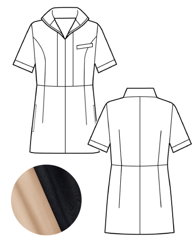 足をすらりとなく見せる高めのウエストラインと知的なスタンドカラーが特徴のエレガントなウェア・左胸/両脇ポケット・前ファスナー開き・胸ポケット内側共布ループ付き 素材:ポリエステル100% 機能:防透・制電・ストレッチ・撥水・撥油・防汚・吸汗・速乾