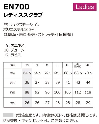 白衣・ナースウェア・介護服・エステウェア通販|ナースウェアドットコム FOLK(フォーク)> ESTNATION (エストネーション) エステウェア> チュニック・カットソー FOLK(フォーク)> スクラブ 受付・事務服 FOLK(フォーク)> 2026年新商品・新色 EN700 レディススクラブ ESTNATION×FOLK(フォーク) 価格: ¥13,200 (税込) ~ ¥19,800 (税込) [ポイント還元 132ポイント~] 販売期間: カラー: 選択してください 9.オニキス 10.デューン 17.ラピス サイズ: 選択してください SS(受注生産) S M L LL 3L 4L 価格: - 数量: 個 在庫 ○ カラーサイズ価格9.オニキスSS(受注生産)¥19,800(税込)S¥13,200(税込)M¥13,200(税込)L¥13,200(税込)LL¥13,200(税込)3L¥13,200(税込)4L¥13,200(税込)10.デューンSS(受注生産)¥19,800(税込)S¥13,200(税込)M¥13,200(税込)L¥13,200(税込)LL¥13,200(税込)3L¥13,200(税込)4L¥13,200(税込)17.ラピスSS(受注生産)¥19,800(税込)S¥13,200(税込)M¥13,200(税込)L¥13,200(税込)LL¥13,200(税込)3L¥13,200(税込)4L¥13,200(税込) 返品・交換についての詳細はこちら レビューはありません ミニマルなデザインに、品格を与える細部へのこだわり 革新的なユニフォームで仕事の質をワンランク上へ シンプルでありながら、品質の良さを感じさせるスクラブ。右胸上部のさりげないロゴマークの刺しゅうが上品。両腰ポケット付きで実用性も兼ね備えます。 【素材】 ES リュクスモーション(ポリエステル100%) (制電糸・速乾・吸汗・ストレッチ・「超」軽量) 【仕様】左胸片玉縁ポケット/両腰ポケット/工業洗濯対応 ※SSサイズは受注生産です。納期は40日~、返品交換不可となります。 コーディネート商品 EN100 ワンピース ESTNATION×FOLK(フォーク) ¥18,700(税込) ~ EN101 ワンピース ESTNATION×FOLK(フォーク) ¥18,700(税込) ~ EN200 チュニック ESTNATION×FOLK(フォーク) ¥16,500(税込) ~ EN201 チュニック ESTNATION×FOLK(フォーク) ¥16,500(税込) ~ EN300 パンツ ESTNATION×FOLK(フォーク) ¥14,520(税込) ~