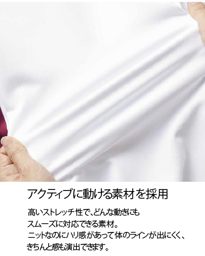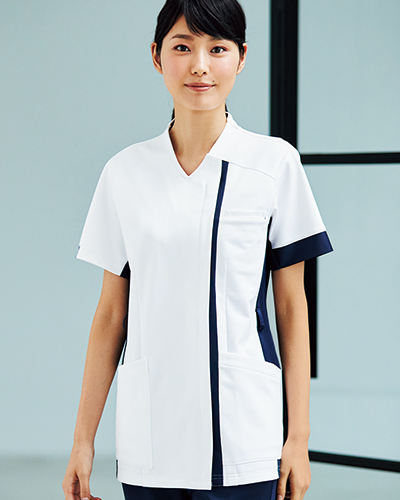 男女を問わない美シルエット。首に沿う立ち襟で品の良さを添えて ・ダーツの切り替えの工夫でムダなゆとりを追放。すっきり美しく着こなせるシルエット。 ・袖のつけ位置を少し前にし、背幅は広めに。身頃と袖のバランスを取った設計で、腕を動かしても背中が突っ張ることなく快適な作業をサポート。 ・後ろ襟下にストラップ留めフラップ付 ・左胸ポケットにPHSホルダー付き ・両腰にキーループ付き ・両腰に二重ポケット付き 【素材】 バルキードライトリコット(ポリエステル100%)<br> SEK、制電、ストレッチ、防透、吸水、速乾、形態安定、工業洗濯可