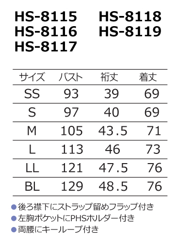 着脱しやすいファスナースクラブ。腰ポケット底をダークネイビーにして、インク染み等を目立ちにくくしたデザイン。ダークネイビーのパンツとコーディネートすれば脚長効果も。 ・後ろ襟下にストラップ留めフラップ付 ・左胸ポケットにPHSホルダー付き ・両腰にキーループ付き 【素材 HS-8115】バルキードライトリコット(ポリエステル100%)SEK、制電、ストレッチ、防透、吸水、速乾、接触冷感、工業洗濯可 【素材 HS-8116/HS-8117/HS-8118/HS-8119】カラーファストトリコット(ポリエステル100%)SEK、制電、ストレッチ、吸水、速乾、通気性、工業洗濯可