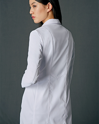 シンプルなテーラードカラーのドクターコートは、素材感とディテールが決め手。