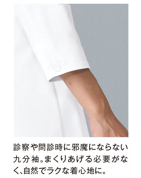 ・診察や問診時に邪魔にならない久分袖。まくりあげる必要がなく、ラクな着心地に。