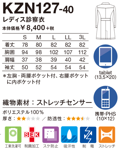 紫外線・可視光線遮蔽セラミックスを練り込んだ十字断面繊維と、防透性能をもったストレッチ糸を織り込んだ高機能ストレッチ素材を使用し、今までになく軽量でさらりとした着心地。ウエストベルトの位置を高くしAラインに仕上げた、後ろ姿まで美しいレディス診察衣。 【織物素材】 ストレッチセンサー(ポリエステル100%) 【仕様】 左胸・両腰ポケット付/右腰ポケットに内ポケット付/センターベント入り
