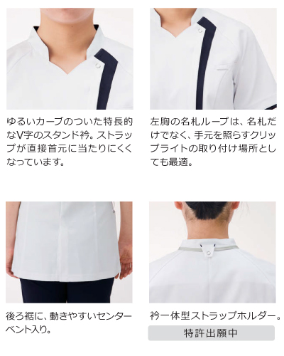 個性を引き出す、こだわりの配色バランス。 スッキリとした印象を与えるフロントの縦ライン。“当たり前のデザインで終わらせない”、着る人の個性(スタイル)を最大限引き出す、こだわり抜いた配色バランスのスクラブジャケットです。 【織物素材】 コンフォートストレッチツイル 【仕様】 左胸に名札ループ付/左胸・右胸下に携帯・PHS対応ポケット付/右腰にループ付/衿一体型ストラップホルダー付/両腰ポケットに内ポケット付/センターベント入り/比翼ファスナー仕様