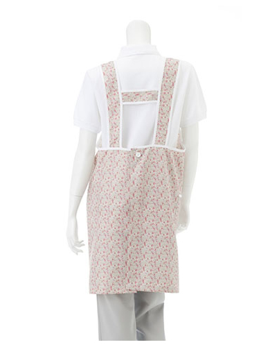 繊細で優しい、リバティプリントを前面に使い、白いトリミングをデザインアクセントにしたエプロンです。リバティプリントを使うことにより、施設内を明るく華やかに演出し利用者の心を和ませます。両脇ポケット付きで、後のヨーク止め布で肩ひもが落ちない工夫が施してあります。【素材】ポリエステル100%
