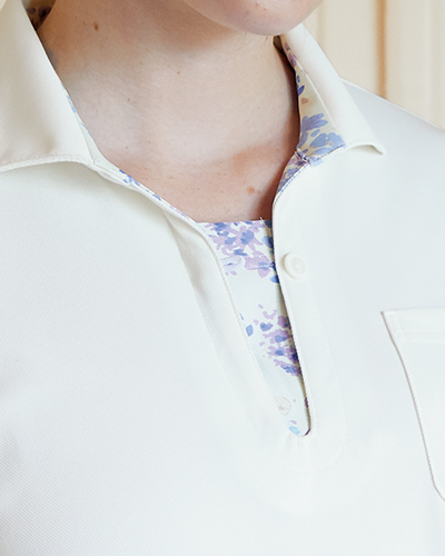 花柄を襟もとや袖口にあしらった、可憐なデザイン。