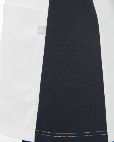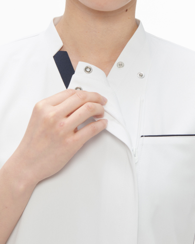 カットが入った衿、ポケットのデザインが新しさを感じさせてくれる男女兼用スクラブ。