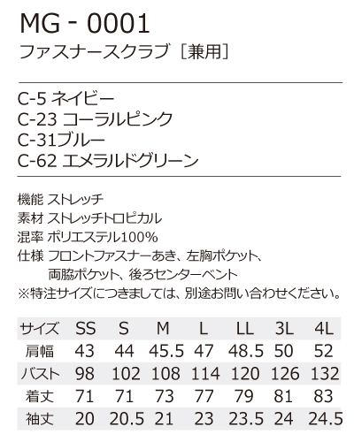 白衣・ナースウェア・介護服・エステウェア通販|ナースウェアドットコム スクラブ ミセス・グロスマン UNITE (ユナイト)> スクラブ UNITE (ユナイト)> Mrs.Grossman’s (ミセス・グロスマン) MG-0001 ファスナースクラブ [男女兼用] ミセス・グロスマン 定価: ¥9,020(税込) 価格: ¥5,412 (税込) 40%OFF [ポイント還元 54ポイント~] 販売期間: カラー: 選択してください C-5 ネイビー C-23 コーラルピンク C-31 ブルー C-62 エメラルドグリーン サイズ: 選択してください SS S M L LL 3L 4L 数量: 個 在庫 ○ カラーサイズC-5 ネイビーSSSMLLL3L4LC-23 コーラルピンクSSSMLLL3L4LC-31 ブルーSSSMLLL3L4LC-62 エメラルドグリーンSSSMLLL3L4L 返品・交換についての詳細はこちら レビューはありません 廃盤予告品です。メーカー在庫がなくなり次第、販売終了となります。 お子様に親しみやすい印象を与える、可愛いワッペン付き シワになりにくく、お手入れ簡単。伸縮性と耐久性のある素材 サラッとした肌触りでシワになりにくいスクラブ。 ゆとりあるシルエットで動きやすく、着丈が長めなので安心感も。 【仕様】フロントファスナーあき、左胸ポケット、両脇ポケット、後ろセンターベント ※ワッペンは、スクラブの色によって種類が異なります。 ※右袖にブランドネームが付いているので、袖に刺繍を入れる場合は「左袖」がおすすめです。 【素材】ストレッチトロピカル(ポリエステル100%) コーディネート商品 MG-0005 ネックストラップ ミセス・グロスマン 定価: ¥2,090(税込) ¥1,254(税込) MG-0002 ナースポーチ(2way) ミセス・グロスマン 定価: ¥5,280(税込) ¥3,168(税込) MG-0003 ナースポーチ(2way) ミセス・グロスマン 定価: ¥4,950(税込) ¥2,970(税込) MG-0004 トートバッグ ミセス・グロスマン 定価: ¥5,280(税込) ¥3,168(税込)
