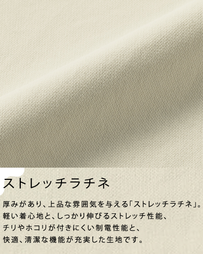 軽い着心地と、しっかりと伸びるストレッチ性能、チリやホコリがつきにくい制電機能と、快適、清潔な機能が充実した生地です。