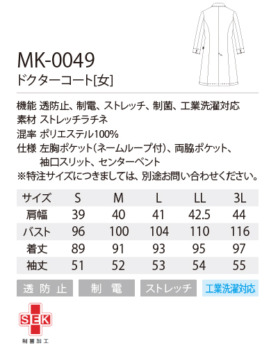 ・MK-0047 レディスドクターコート(比翼仕立)