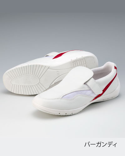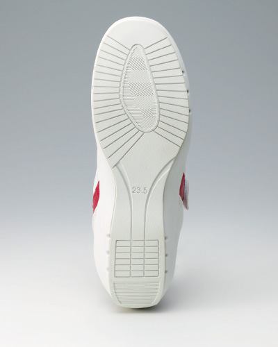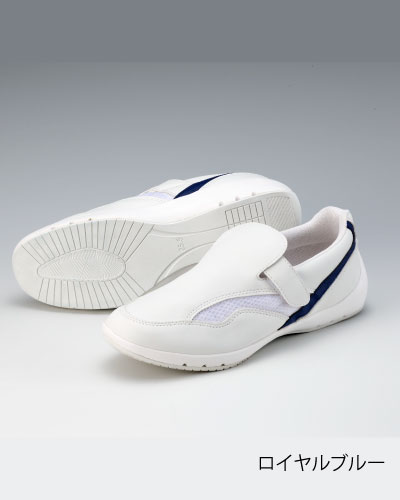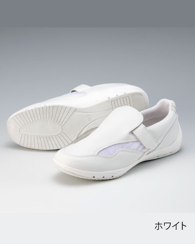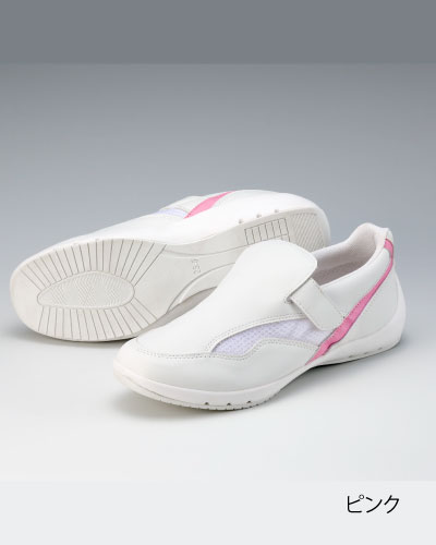 合皮メッシュ付 このシューズは病院・施設などの室内での使用を前提にした商品です。アッパーの両サイドにメッシュ素材をバランスよくデザインに取り入れたことにより、空気の流通ができ靴内でのいやな熱や湿度を緩和しております。