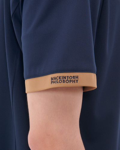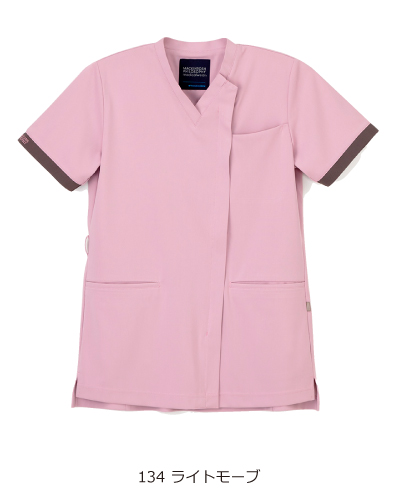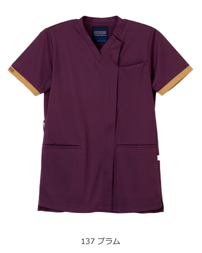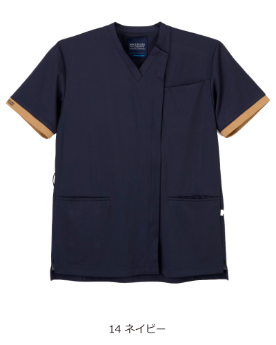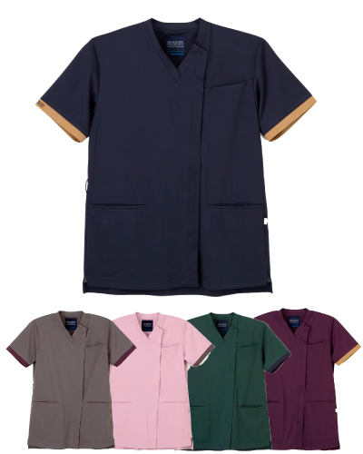 袖口の配色パーツがアイキャッチになるユニセックススクラブ。