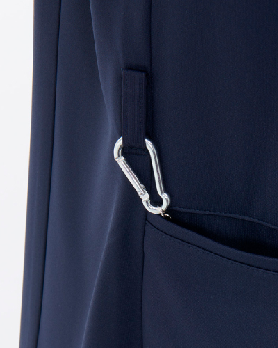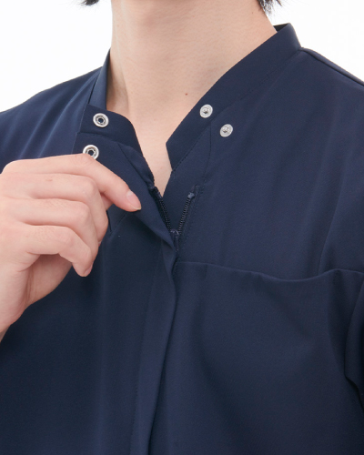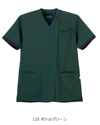 袖口の配色パーツがアイキャッチになるユニセックススクラブ。ポケットの形状など細部にこだわったデザイン。フロントファスナー開きで着脱がしやすくなっています。 ●男女兼用 ●ファスナータイプ ●右脇シングルループ ・ポリエステル90%、キュプラ10%(制電糸入り) ・ニット(ワープニット)