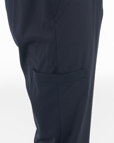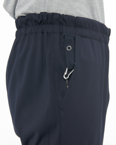 【詳細】ノータック細身ストレートシルエット、右脇ポケット口スナップ付きループ