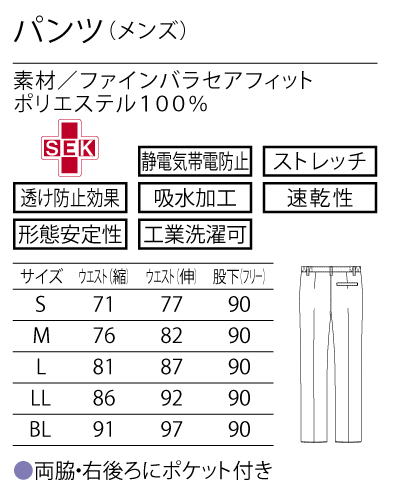 ソフトな肌触りと伸縮性 ストレートシルエット ・両脇、右後ろにポケット付き 【素材】ファインバラセアフィット(ポリエステル100%)SEK、制電、ストレッチ、防透、吸水、速乾、形態安定、工業洗濯可