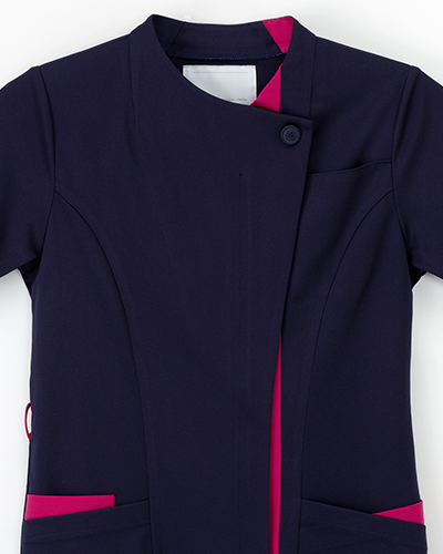 飛沫感染予防のために襟ぐりの開きを浅くして肌の露出を抑えました。