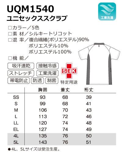 UQM1540 ルコックスポルティフ ユニセックススクラブ(男女兼用) ◆ルコックスポルティフらしいスポーティーなスクラブ ◆上品な色合いの5色展開。吸汗速乾・接触冷感・工業洗濯・ストレッチ・防透・帯電防止・制菌 ◆シルキートリコット/複合繊維(ポリエステル)90%・ポリエステル10%・ポリエステル100%(カオチン)。
