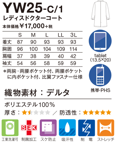 フロントやポケット、直線使いが新しいドクターコート。他とは違う独創的な感性から生まれたウエアが美の新たな概念を打ち出す。使用している「デルタ」は上品で上質な風合いでなめらか。着心地と動きやすさを兼ね備えた最上の機能美を追求しています。 【織物素材】 デルタ(ポリエステル100%) 【仕様】 両胸・両腰ポケット付/両腰ポケットに内ポケット付/比翼ファスナー仕様