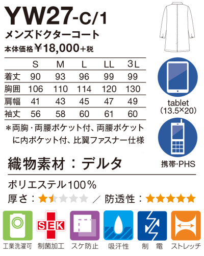 フロントやポケット、直線使いが新しいドクターコート。他とは違う独創的な感性から生まれたウエアが美の新たな概念を打ち出す。使用している「デルタ」は上品で上質な風合いでなめらか。着心地と動きやすさを兼ね備えた最上の機能美を追求しています。 【織物素材】 デルタ(ポリエステル100%) 【仕様】 両胸・両腰ポケット付/両腰ポケットに内ポケット付/比翼ファスナー仕様