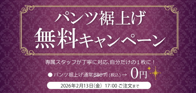 【~2026/02/13(金)17:00まで】の期間中にお買上げの商品で、ご注文時に裾上げ依頼したものがキャンペーンの対象となります。裾上げご希望のパンツの枚数と同等数をカートに入れ、股下もしくは丈詰めの長さをご記入ください。